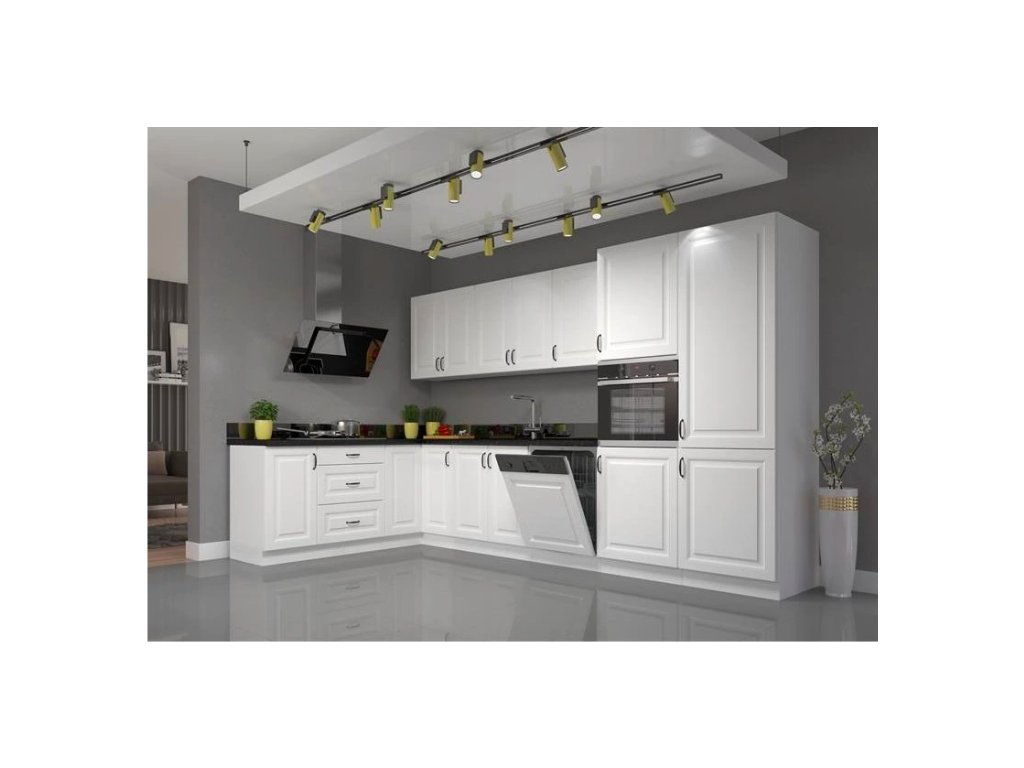 Kuchyňská linka Stilo - bílý mat / bílá 210/350 cm, kuchyňskou linku můžete zakoupit buď jako sestavu, nebo po jednotlivých komponentech. Kuchyňská linka je dodávána v demontu. Korpus linky je v barvě bílé. Dvířka jsou v barvě bílý mat. Kuchyňská linka je bez pracovní desky.